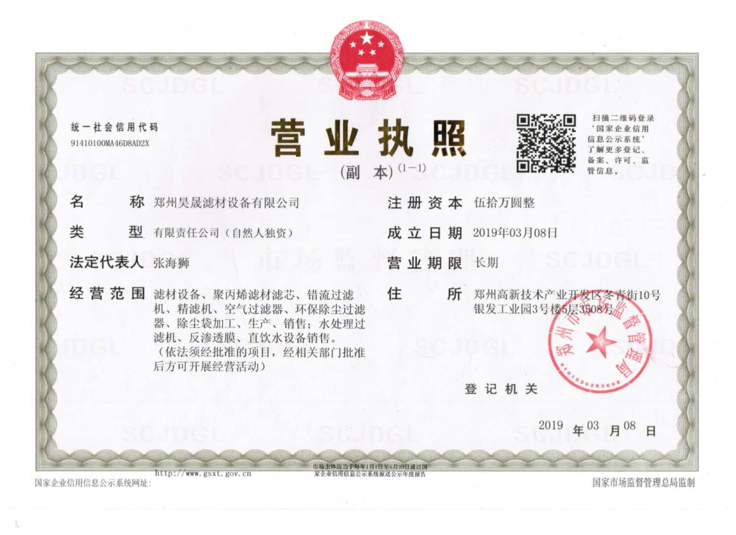 鄭州昊晟濾材設備有限公司位于鄭州市高新技術產業開發區冬青街10號銀發工業園,2019年03月08日在工商局注冊成立,注冊資本為50萬元人民幣(萬元)。 在公司發展壯大的1年里,我們始終為客戶提供良好的技術支持、 健全的售后服務。擁有離壓靜電現代技術聚合超細纖維深層膜濾芯生產線,其中生產的深層膜濾芯達到一次性無菌過濾,是廣大啤酒、白酒、葡萄酒、水處 理、油脂化工生產企業提高產品質量,延長保質期,是企業的可靠保證。 我公司主要經營濾材設備、聚丙烯濾材濾芯、錯流過濾機、精濾機、空氣過濾器、環保除塵過濾器、除塵袋加工、生產、銷售;水處理過濾機、反滲透膜、直飲水 設備銷售。